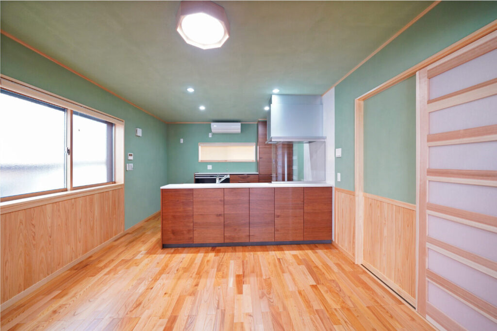 若草色の壁紙と木の腰壁が爽やかな、和のテイストを素敵に盛り込んだお家。