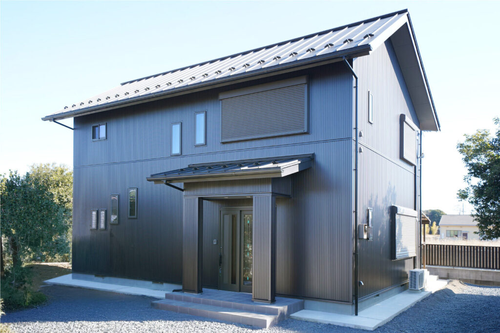 黒いガルバリウムのシックな外観とは対照的に明るく開放的なリビングが気持ちの良い家